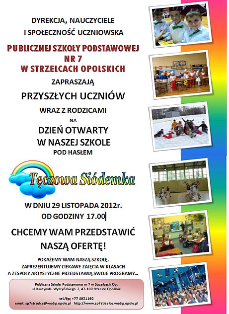 Dyrekcja , nauczyciele i społeczność uczniowska Publicznej Szkoły Podstawowej Nr 7 w Strzelcach Opolskich zapraszają przyszłych uczniów wraz z rodzicami na Dzień Otwarty w Szkole pod hasłem "Tęczowa Siódemka" - 29 listopada 2012r.